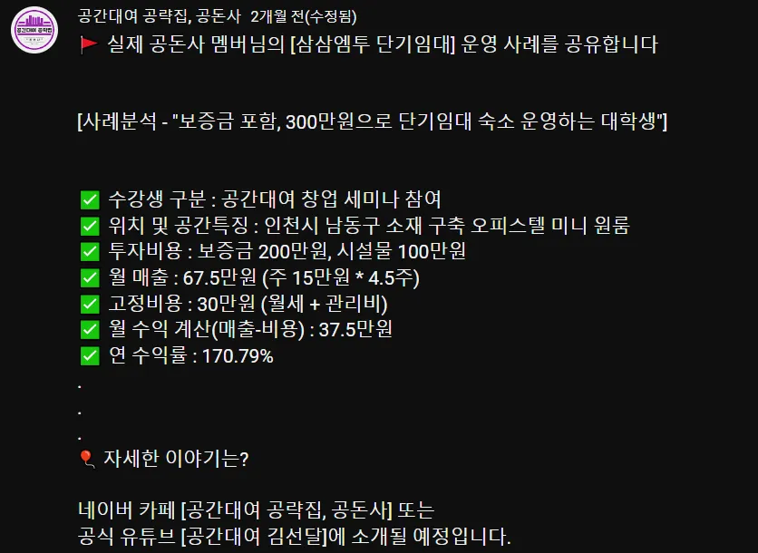 “보증금 포함, 300만원으로 합법 단기임대 숙소 운영하고 있습니다.”